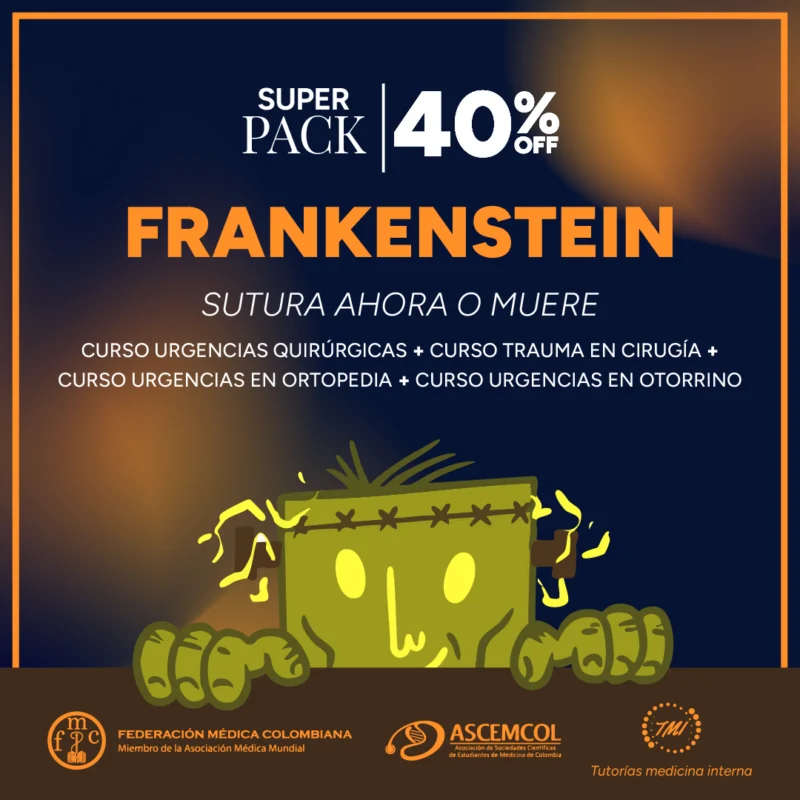 Un superpack “armado por partes”, como el mismísimo monstruo de Frankenstein ⚡. Aquí integrarás urgencias quirúrgicas, trauma en cirugía, ortopedia de urgencias y otorrinolaringología en emergencias. Con este pack tendrás la visión completa del paciente quirúrgico crítico, desde el politrauma hasta la vía aérea difícil. Aprende protocolos actualizados y casos reales que te preparan para cualquier sala de urgencias.